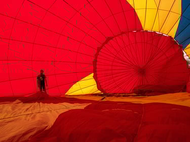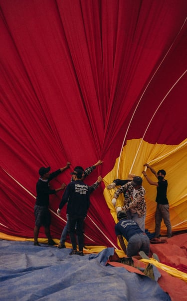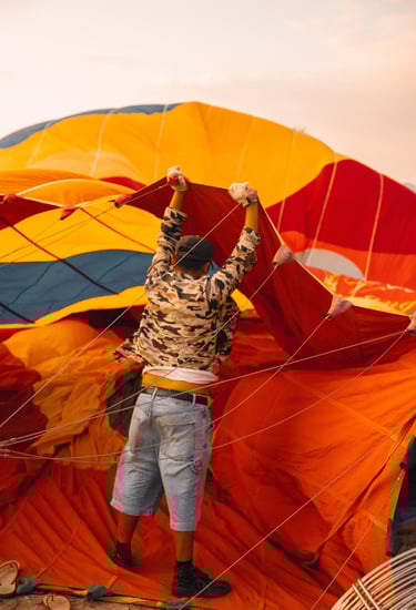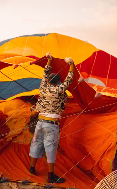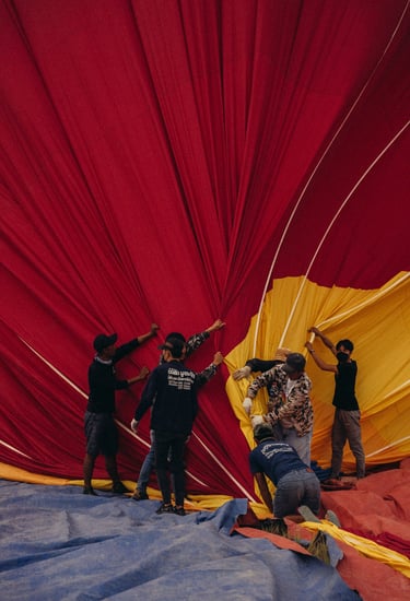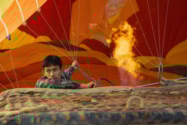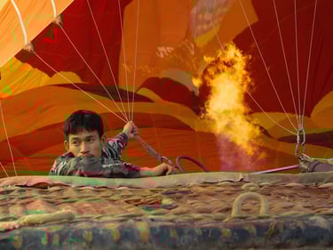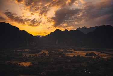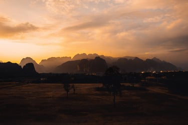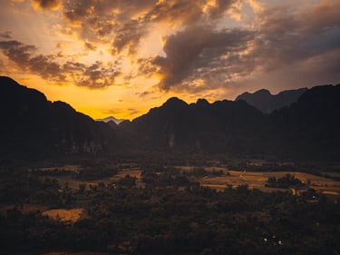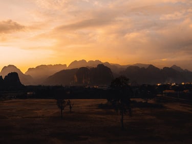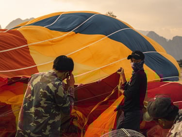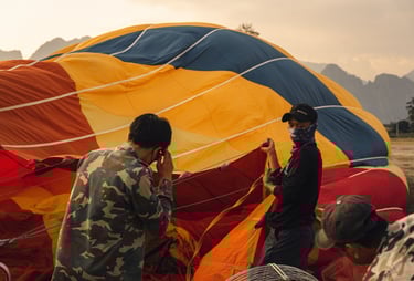 La balade aérienne en montgolfière, près des montagnes du Laos permet de découvrir des paysages d’une façon différente et d'admirer la préparation de l'envol de ce mastodonte par une quinzaine de personnes. En s’élevant doucement dans les airs, on commence à découvrir les paysages sous un angle différent. Les montagnes se dévoilent alors sous un nouveau jour.